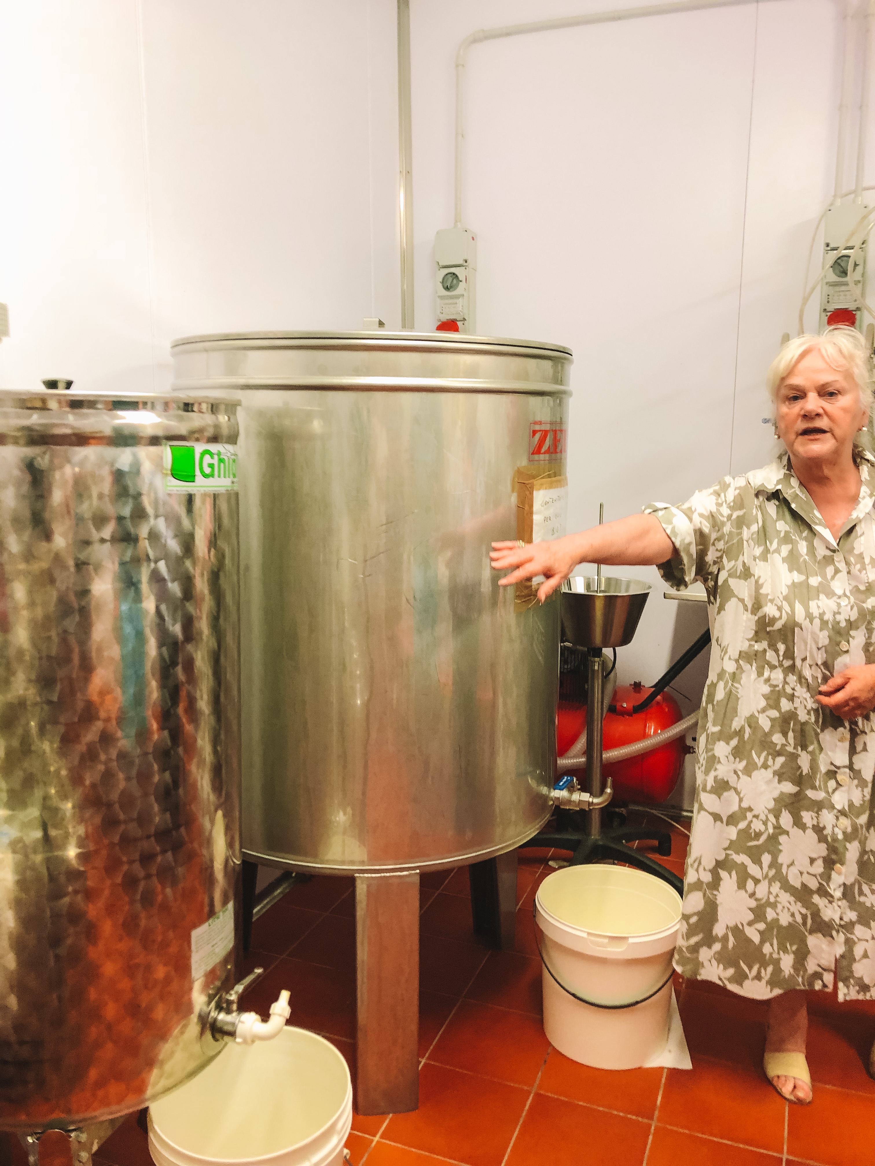 From there we went on to see where they store, bottle and label their Extra Virgin Olive Oil. It is pressed off site. Good Extra Virgin Olive Oil is frutty, bitter , pungent with a peppery sensation. It is important to consume it within its 2 year shelf life, as it doesn’t last long even in perfect conditions. It should always be stored in glass (not clear) in a cool dark place, not next to your stove or by a window. The smell of the huge vat of fresh olive oil was heavenly.