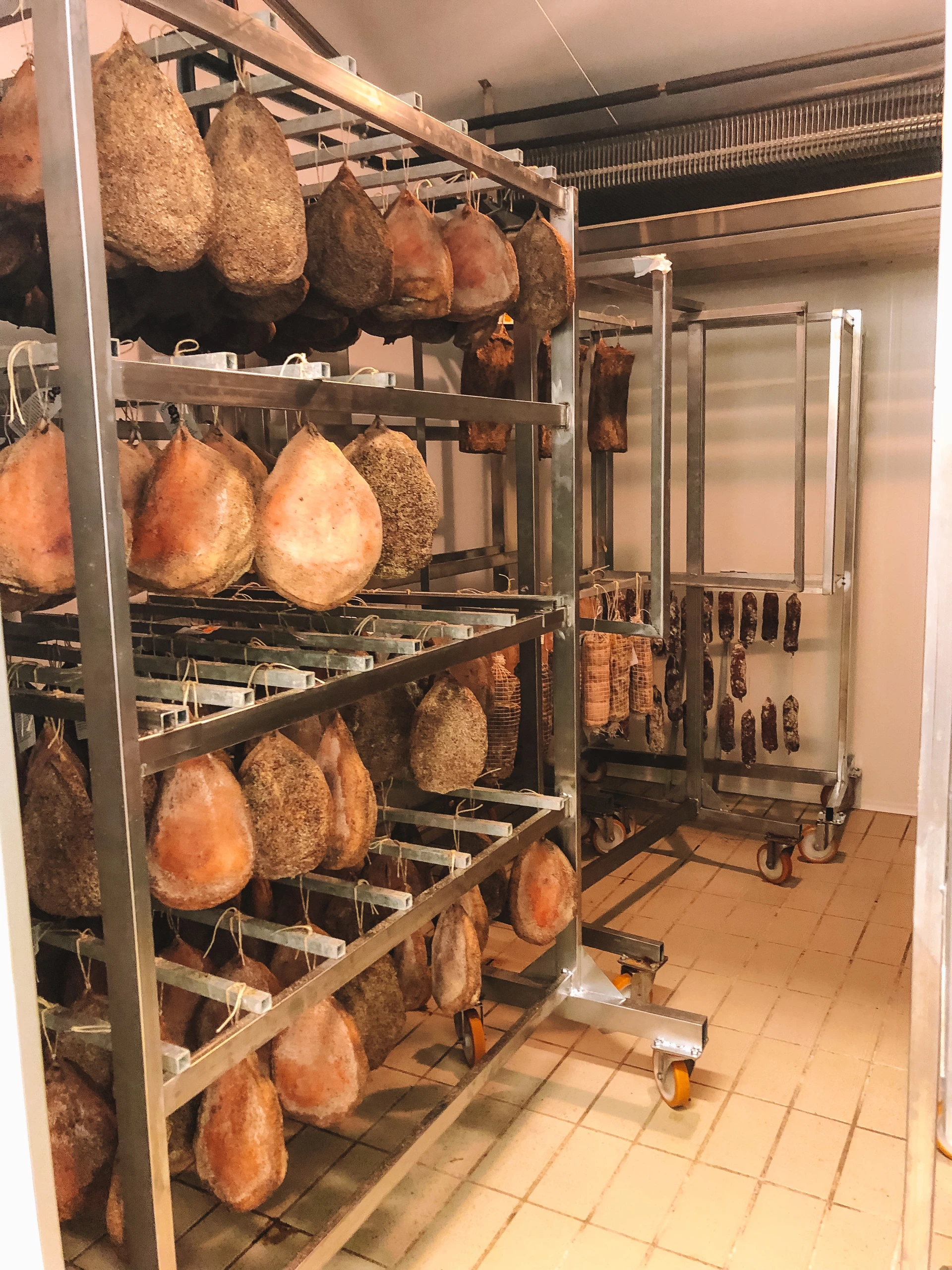 We toured the facility where the meats are cured, from the outside it looks like a traditional “old” Tuscan building, but inside it is a completely modern facility. We saw three rooms full of meats curing, they were beautiful and smelled amazing.