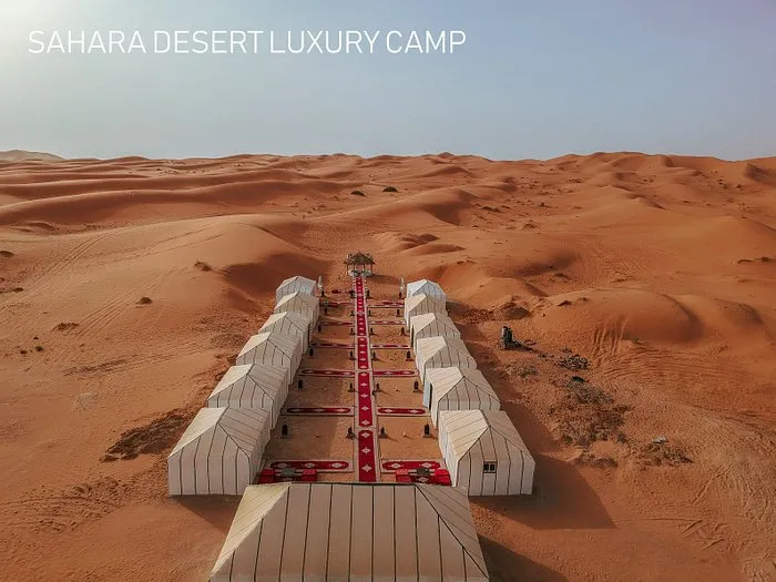 Upon arrival, you’ll mount your camel and begin a picturesque hour-long trek across the golden sands, eventually reaching your luxury desert camp. Here, you’ll settle in for an unforgettable evening — enjoy a delicious dinner, gather around the fire for local music, try sandboarding on the dunes, and soak in the beauty of a star-filled desert sky. Your tent is fully equipped with everything you need for a cozy and comfortable night in the Sahara.